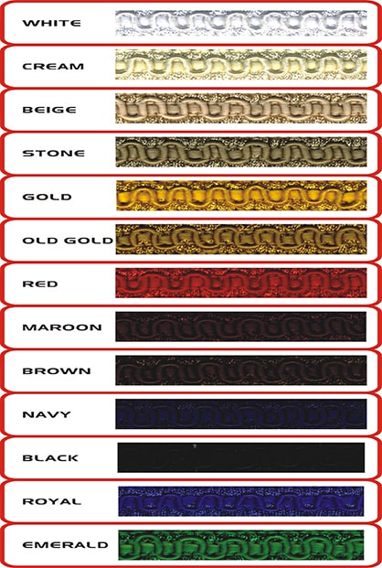 | COLOUR | WHITE, CREAM, BEIGE, STONE, GOLD, OLD GOLD, RED, MAROON, BROWN, NAVY, BLACK, ROYAL, EMERALD |