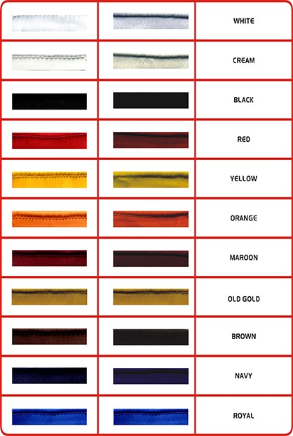 | COLOURS | BLACK – 7, BROWN – 17, CREAM- 6, MAROON – 22, NAVY – 10, OLD GOLD – 68, ORANGE – 28, RED – 11, ROYAL – 9, WHITE – 1, YELLOW – 5 |