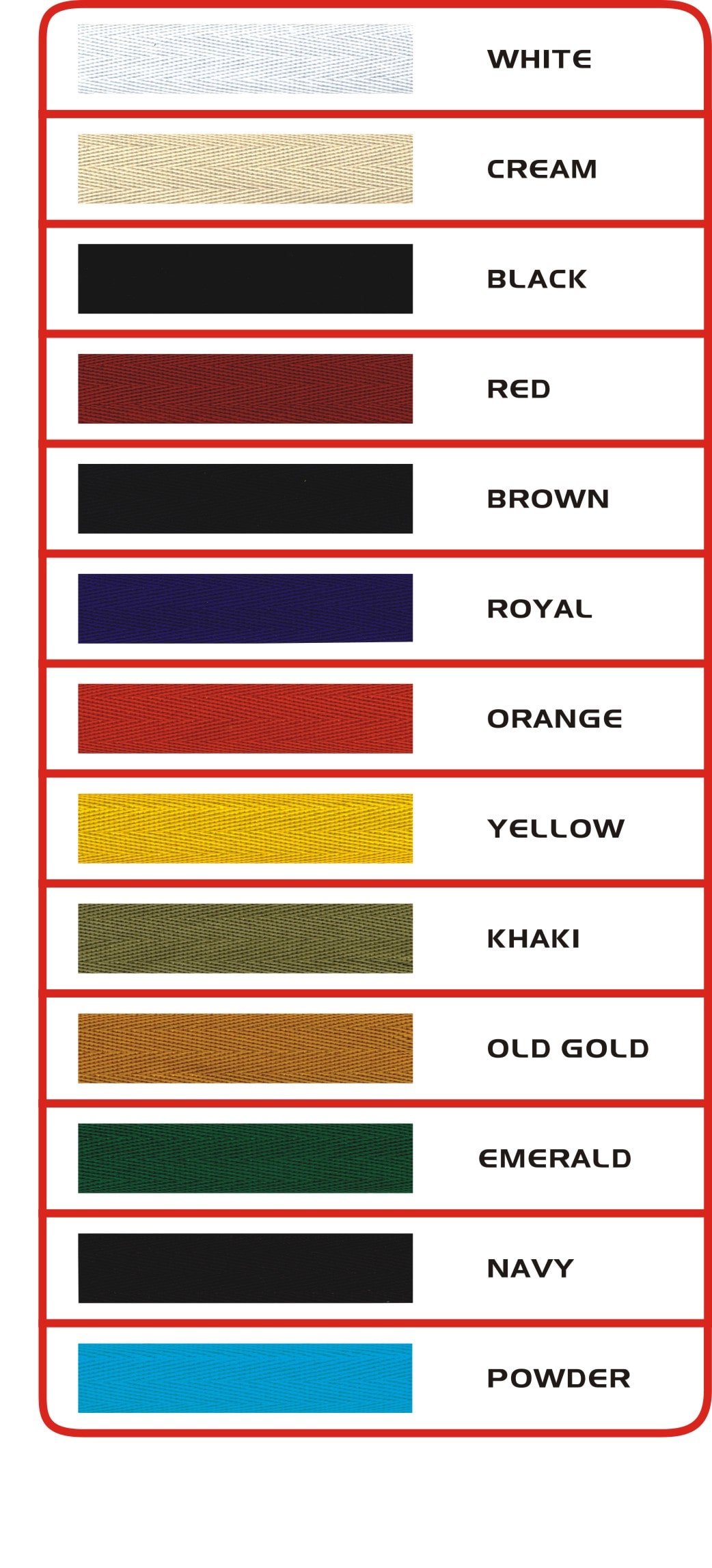 | COLOURS | BLACK – 7, BROWN – 17, CREAM- 6, EMERALD – 19, KHAKI – 45, NAVY – 10, OLD GOLD – 68, ORANGE – 28, POWDER – 8, RED – 11, ROYAL – 9, WHITE – 1, YELLOW – 5 |